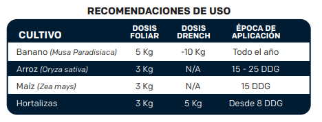 • Se aplica a cultivos de hidroponía, tiene excelentes resultados debido a sus elementos básicos en este tipo de cultivos.