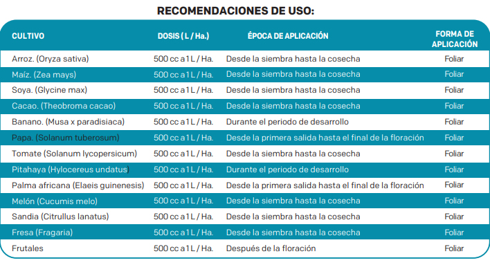 No presenta incompatibilidad con la mayoría de productos de uso agrícola más frecuentemente utilizados. Es recomendable realizar una prueba de compatibilidad antes de realizar una aplicación.