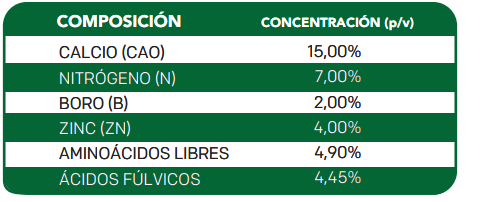Se deriva de quelato de Calcio es una formulación de microgránulos quelados con EDTA y sulfato de zinc y del ácido bórico y contiene un 15 o/o de calcio, un 4 o/o de zinc, un 2 o/o de boro un 7 o/o de nitrógeno, un 4,45 o/o Ácidos Fulvicos enriquecidos de aminoácidos.