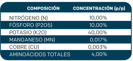 Es un fertilizante cristalino de alta pureza, completamente soluble al agua. Es una fuente balanceada de Nitrógeno, Potasio, y Fósforo cuyo contenido de cloruros es muy bajo.