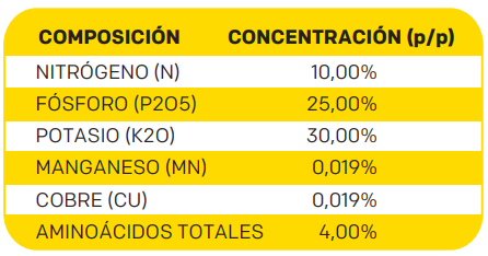 Es un fertilizante cristalino de alta pureza, completamente soluble al agua. Es una fuente balanceada de Nitrógeno, Potasio, y Fósforo cuyo contenido de cloruros es muy bajo. Para uso en varios cultivos, como corrector carencial de macroelementos vía foliar o radicular.
