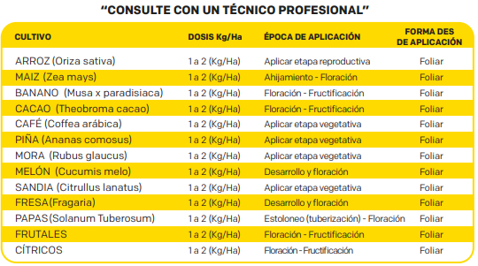 Durante la mezcla y aplicación utilizar el equipo de protección adecuado. Evite almacenar una vez abierto el envase. Ya que es un producto higroscópico y podría afectar su apariencia física. “Este producto puede tener concentraciones de Cloro (Cl-) superiores al 10%”.“La información presentada sirve como una referencia, la cual puede ser acogida de acuerdo al estado y requerimiento nutricional del cultivo, condiciones de clima y propiedades físicas y químicas del suelo”