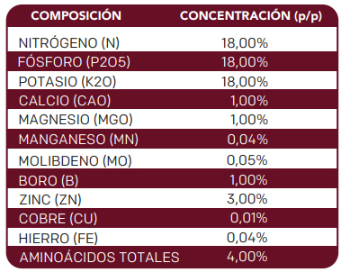Fuente balanceada de Nitrógeno, Potasio, y Fósforo, corrector carencial de macroelementos vía fol