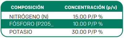Fuente balanceada de Nitrógeno, Potasio, y Fósforo, corrector carencial de macroelementos.
