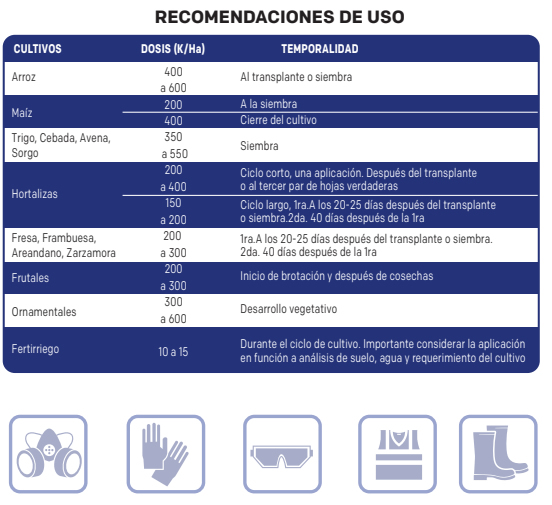 Aplicar durante el ciclo del cultivo, es importante considerar la aplicación en función a análisis de suelo, agua y requerimiento del cultivo.